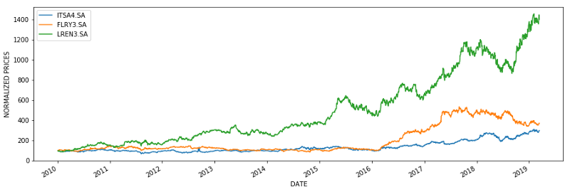 Primeiramente, utilizei o Pandas para importar os dados históricos diários das ações de Itaúsa (ITSA4), Fleury (FLRY3) e Lojas Renner (LREN3) desde 01/01/2010 até 13/03/2019 a partir do banco de dados do Yahoo Finance. Após pesquisar no próprio site do Yahoo os códigos (tickers) das ações que eu desejava analisar, criei uma variável (prices), que é basicamente uma tabela (pandas.Dataframe()) que é preenchida com os dados a serem importados. Os dados importados contém uma série de colunas, como preço de abertura, preço de alta, preço de baixa etc. Nesta análise, estou importando apenas uma coluna que fornece o preço de fechamento ajustado (‘Adj Close’) de cada ativo. Achei incrível como o Python pode importar tantos dados com tamanha facilidade!