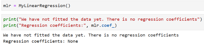 Now, we can create an instance of the class MyLinearRegression called mlr. What happens if we try to print the regression parameters?