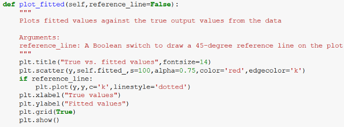 Note that a method is like a normal function. It can take additional arguments. Here, we have an argumentreference_line (default set to False) which draws a 45-degree reference line on the fitted vs true plot. Also, note the docstring description.