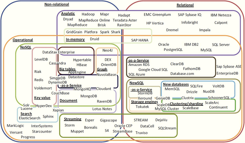 Relational Database Management Systems (RDBMS) emerged in the 1970’s to store data as tables with rows and columns, using Structured Query Language (SQL) statements to query and maintain the database. A relational database is basically a collection of tables, each with a schema that rigidly defines the attributes and types of data that they store, as well as keys that identify specific columns or rows to facilitate access. The RDBMS landscape was once ruled by Oracle and IBM, but today many open source options, like MySQL, SQLite, and PostgreSQL are just as popular.
