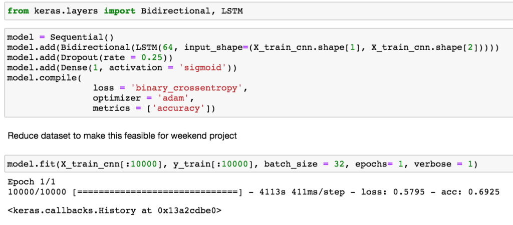 Since this data signal is time-series, it is natural to test a recurrent neural network (RNN). Here we will test a bidirectional long short-term memory (LSTM). Unlike in dense NN and CNN, RNN have loops in the network to keep a memory of what has happened in the past. This allows the network to pass information from early time steps to later time steps that usually would be lost in other types of networks. Essentially there is an extra term for this memory state in the calculation before passing through a non-linear activation function. Here we use the bidirectional information so information can be past in both direction (left to right and right to left). This will help us pick up information about the normal heart beats to the left and right of the center heart beat.