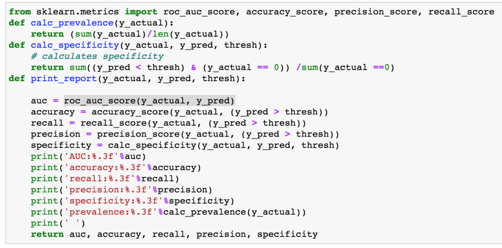 We can build some functions for metrics reporting. For more discussion of data science classification metrics see my prior post here.