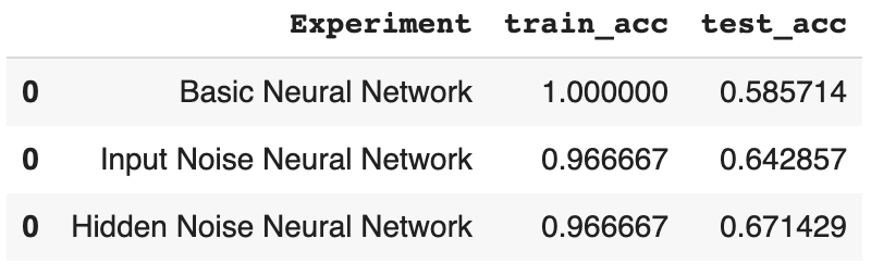 With the use of noise as a regularization method in the input layer, we have decreased the overfitting in our model, furthermore, we have improved the test_accuracy=0.642.