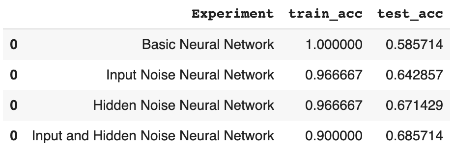 We can see that the best results were achieved with a network with 300 neurons in the hidden layer and with noise_amount=0.001 with an accuracy of about 83%.
