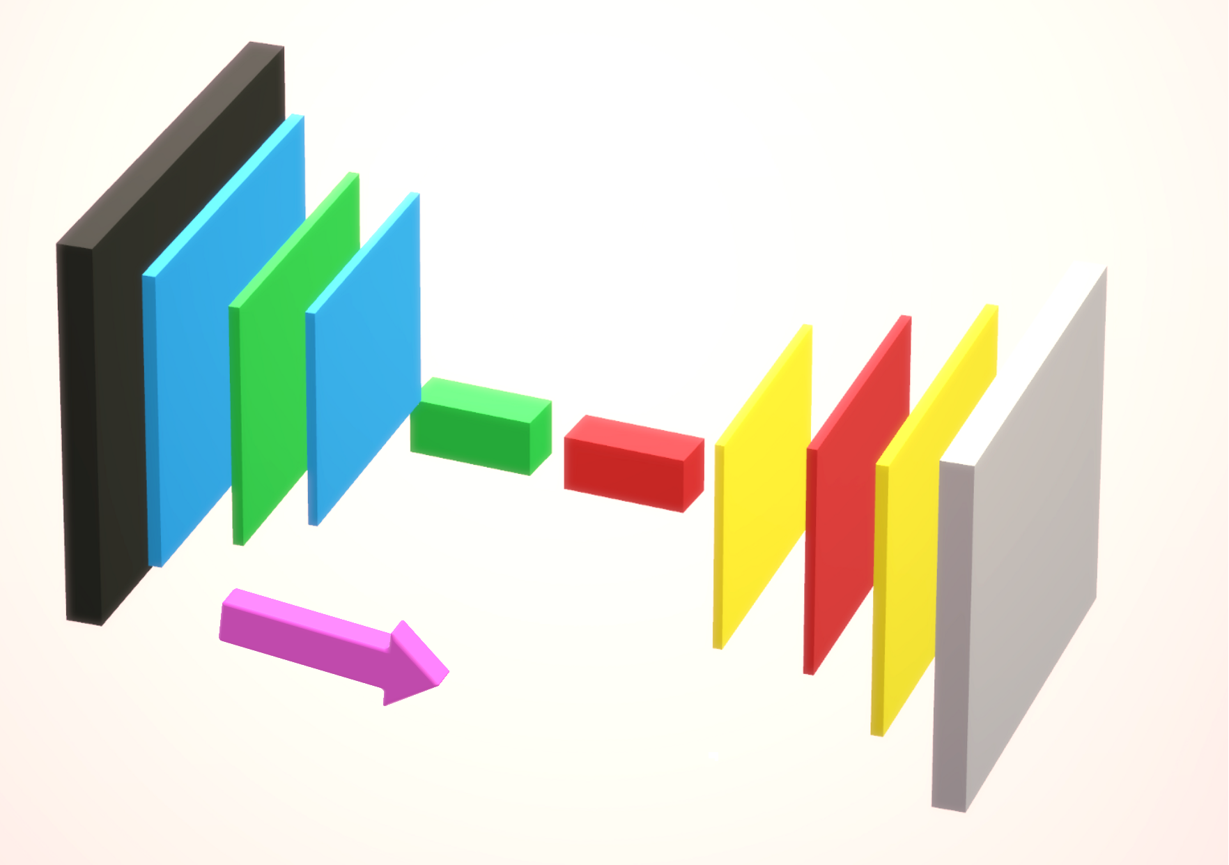 Blue / Green Square → Encoder Portion, 3 convolution operation and in the final layer we vectorize the image (Flatten)