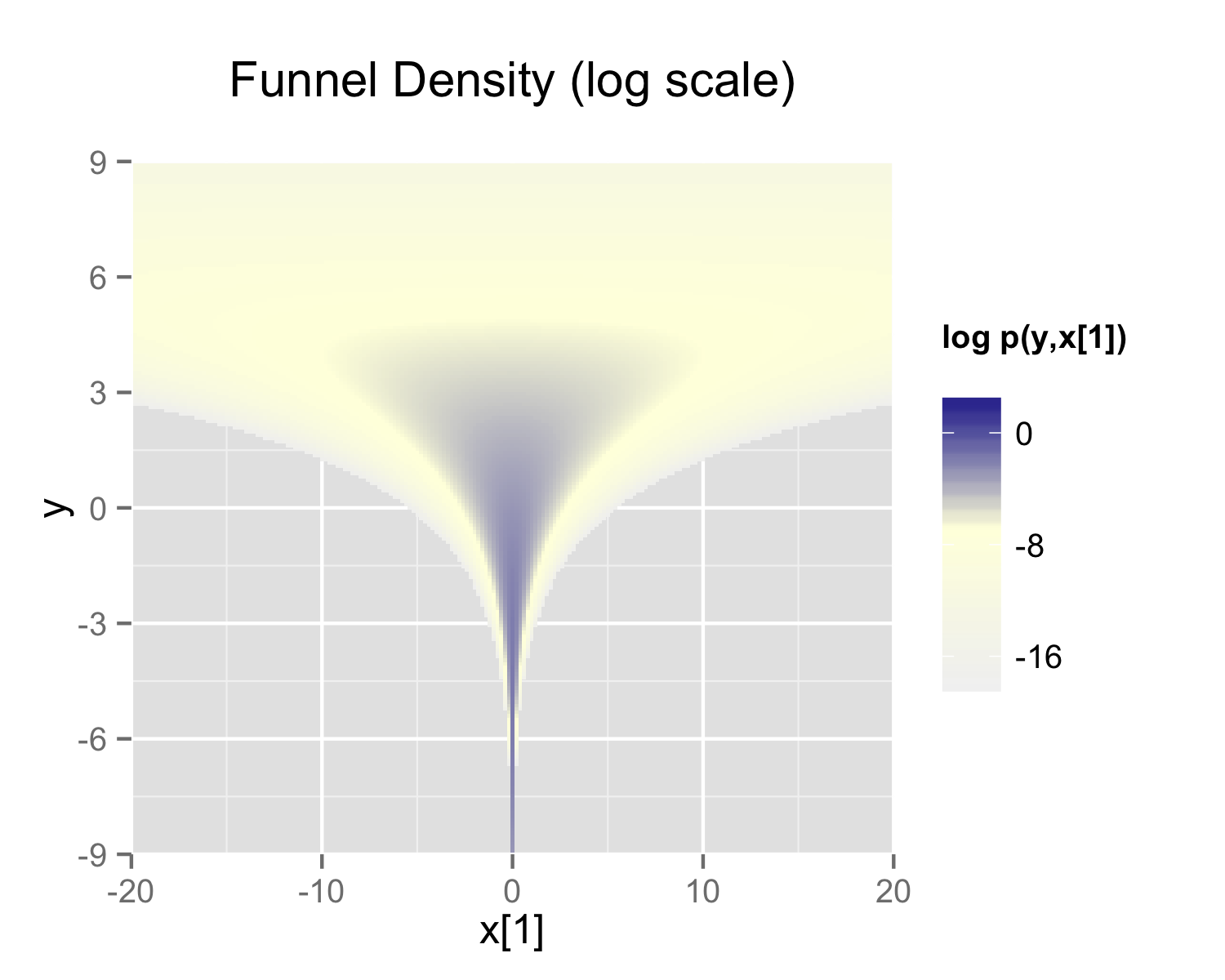 As an illustration, let’s try both NUTS and ADVI on a multimodal posterior. It commonly shows up in mixture models, but we’ll use the simplest example possible: