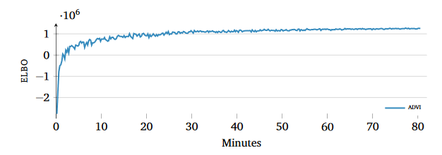 Just like SGD algorithms, we can inspect whether the objective function has converged or not. In reality, it’s hard to know when to stop. The ELBO can jump once it escapes a local optimum, but we can’t tell that it’s stuck in a local optimim. While the trace plot is nice, the real diagnostic is…