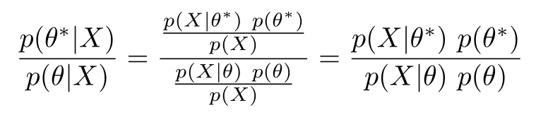 - If p(X|θ*)p(θ*) > p(X|θ)p(θ), accept proposed value. Otherwise, accept the proposed value with probability [p(X|θ*)p(θ*)] / [p(X|θ)p(θ)] .