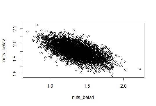 advi_beta2 <- advi@sim$samples[[1]][['beta2']]plot(nuts_beta1, nuts_beta2)
