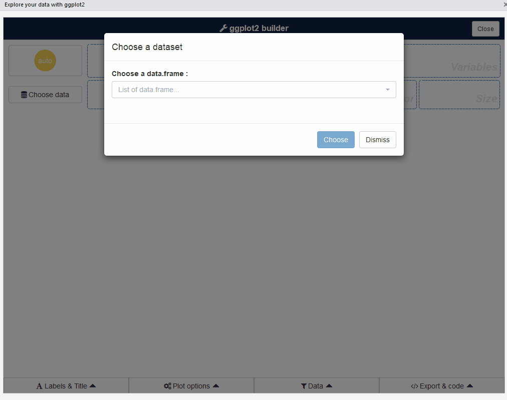 As you can see above, the function esquisser takes the dataframe which we want to visualize as the argument and if nothing is provided, it would consider the dataframes in the current R environment space as options. If there’s no dataframes in the current R environment space, then inbuilt datasets like diamond are provided.