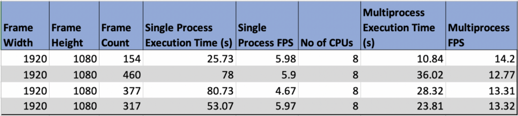 From this experiment, we can observe 2x more frames being processed per second when using all cores to process the video.