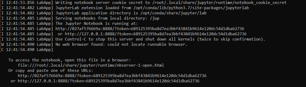 This implies that our docker container is up and running. You can now open the URL specified in the above output and play with Jupyter and the visual debugger without even realizing that it is not running on the host machine.
