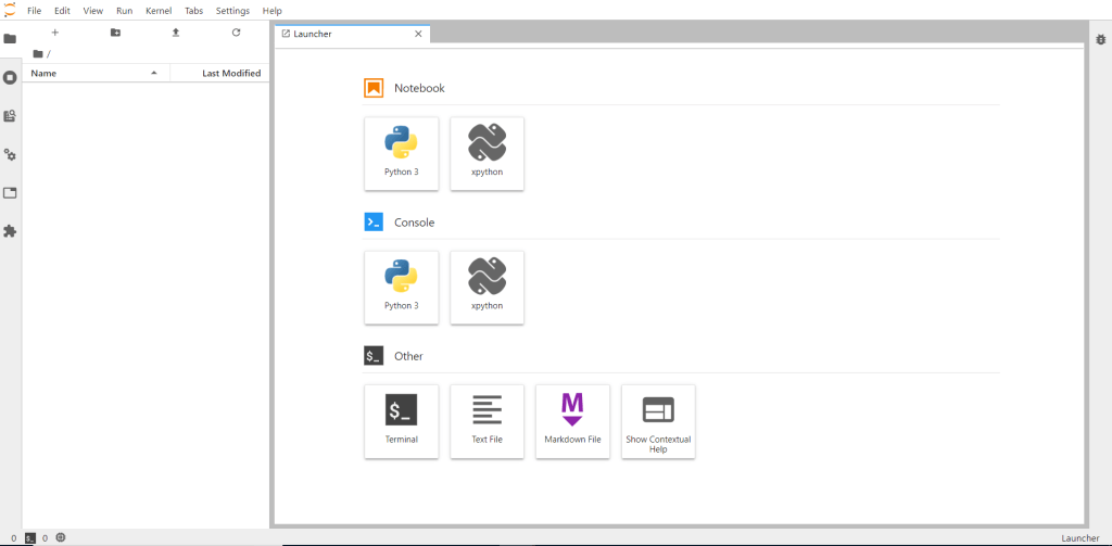Now if you run the Jupyter Lab, you should be able to see 2 additional icons, 1 each in the console and notebook sections for the xeus-python kernel.