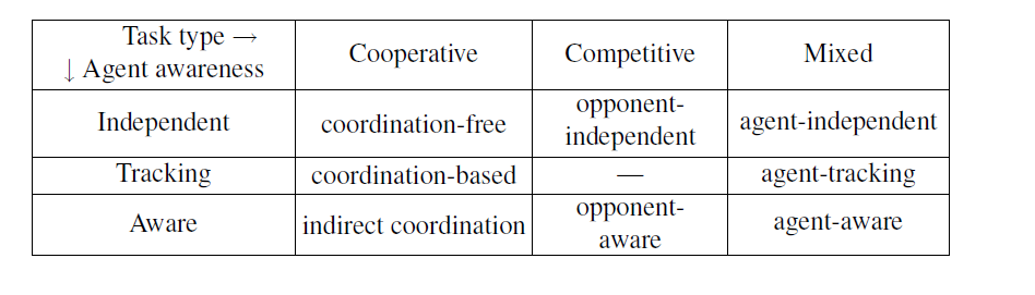To that level, we can add another interesting classification criteria is based on the type of task the agents in a MARL system need to perform. For instance, in some MARL environments, agents make decisions in complete isolation of other agents while, in other cases, they coordinate with cooperators or competitors.