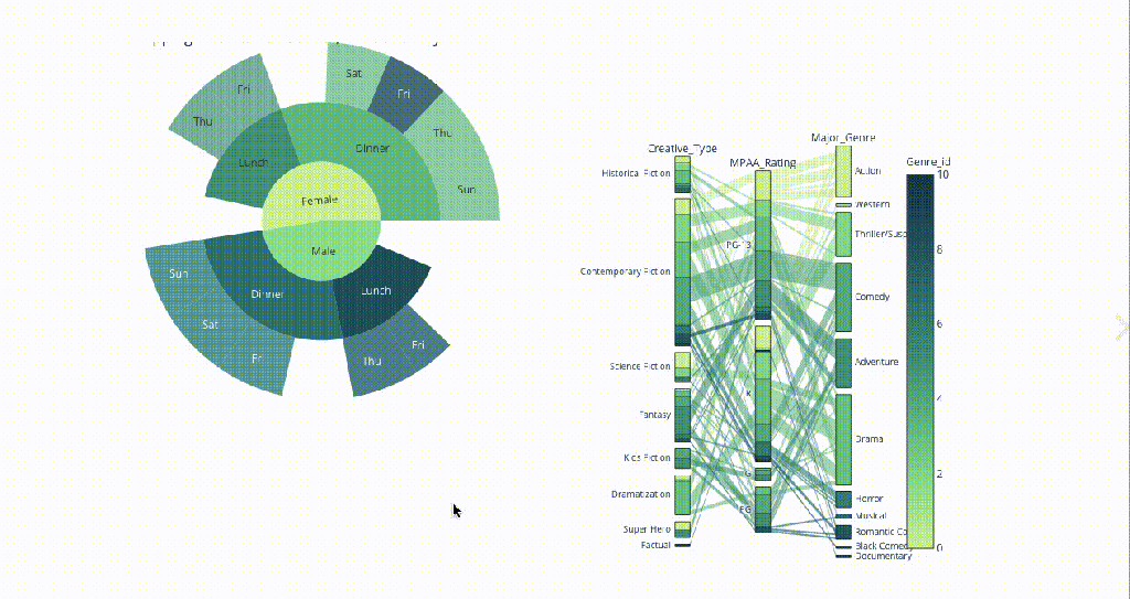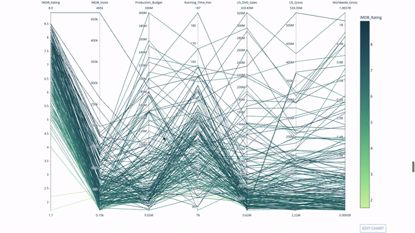 Imagine you’ve covered what you thought was important for your presentation and then get follow-up questions from your audience that refer to minor details or a certain subgroup of your population. Now, you have to go back to your code to retrieve an answer or follow up on that later. Wouldn’t it be way easier to just slice up your plot and retrieve whatever needed right on spot? Check out, for example, this parallel coordinates plot that you can filter and highlight on any variable: