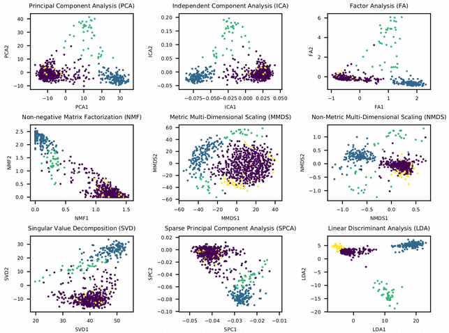 It is really fascinating to observe how the data is converted into the latent low-dimensional representation, and each of the dimension reduction techniques deserves its own article. It is interesting to think about why basically each of the techniques is applicable in one particular research area and not common in other areas. For example, Independent Component Analysis (ICA) is used in signal processing, Non-Negative Matrix Factorization (NMF) is popular for text mining, Non-Metric Multi-Dimensional Scaling (NMDS) is very common in Metagenomics analysis etc., but it is rare to see e.g. NMF to be used for RNA sequencing data analysis.